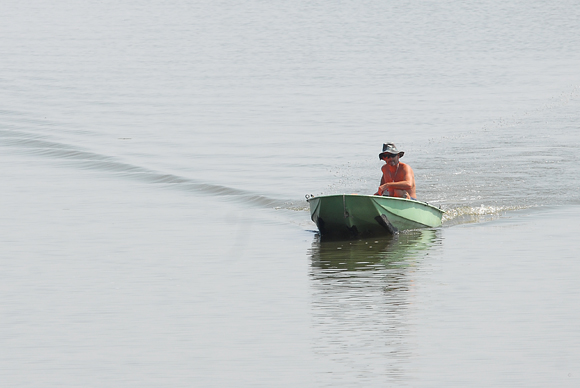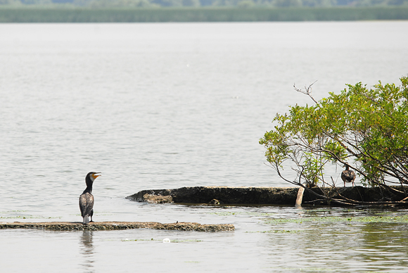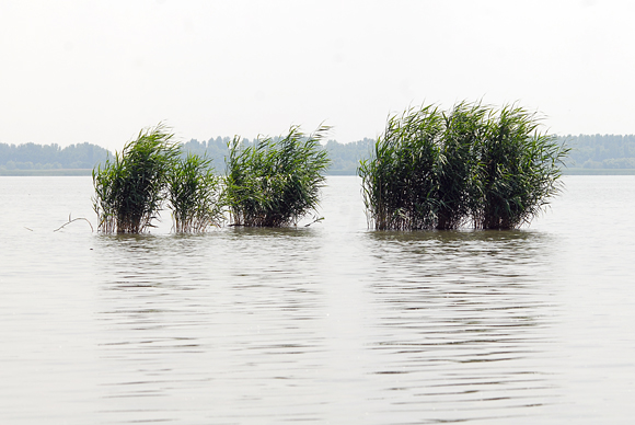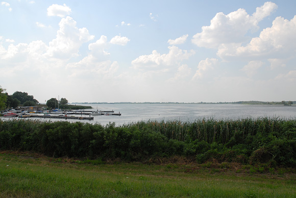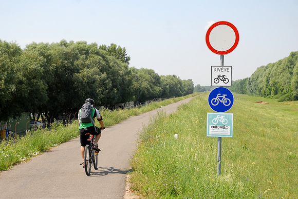 A híd után balra ráfordultunk a töltés tetején haladó, az Eurovelo hálózat részét képező kerékpár útra. Az út kifogástalan állapotú, a töltés rézsűi mindenhol lekaszálva, az aljban, mindkét oldalon fasor, amelyet a tó felől időnként horgászállások törnek meg. A Tisza-tó nádasai a fák felett is látszanak, de néha lementem egy-egy üresen álló beállóhoz, ha valami érdekeset láttam.