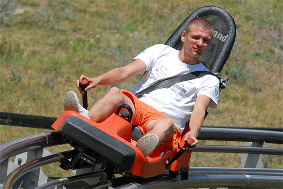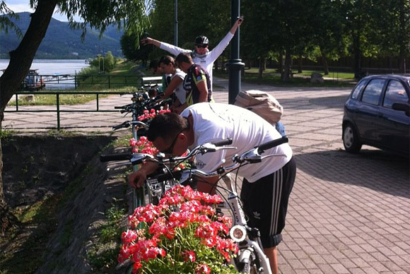 Az persze túl egyszerű lett volna, hogy szépen bepedálozunk Visegrádra a városkapun keresztül, sík terepen, ezért az utolsó kilométerekre egy kis nehezítést iktattunk a programba, a Panoráma-úton felmentünk a nyári bobpályához. Itt ereszkedett egyet a társaság, majd pótolta a folyadék és kalóriaveszteséget.