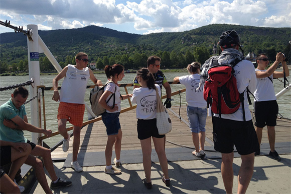 A Panoráma-út a egyenesen a rév kikötőhöz vezet. A hazautat vonattal terveztük, de mivel arra Nagymaroson lehet felszállni, át kellett oda hajózni. A rév éppen kikötött, a visszaútra pedig majd' egy órát kellett várni. A várakozás alatt kellőképpen megéhezett mindenki, így többnyire nem volt gond a Maros étteremben megrendelt halak és egyéb étkek elfogyasztásával.