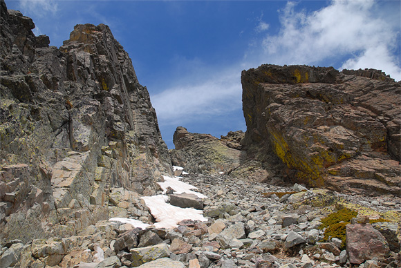 Az ösvény itt még a bokrokra felkötött piros-fehér szalagok és kőkupacok jelezték, felfestett jelzés nincs. Ahogy egyre feljebb haladtunk, a szalagok eltűntek, és a kőkupacokat is egyre nehezebb volt megtalálni. Az emelkedő is egyre meredekebbé vált, köveken, törmeléken haladtunk felfelé és elhaladtunk az első hófolt mellett is. Itt újra át kellett kelni egy patakon, szerencsére jókora sziklák között zúdult lefelé, így nem okozott különösebb gondot, hogy átjussunk a túloldalra.