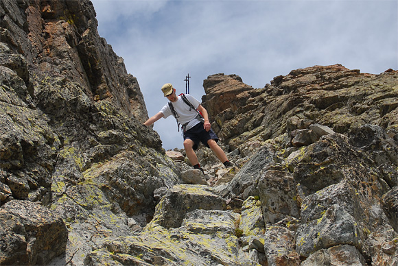 Tovább másztam, ezen a részen már megint némiképp könnyebben lehetett haladni. Az egyetlen lehetséges út jobbra fordult, egy 7-8 méteres hasadékon vezetett felfelé, két szikla között. Fent újra megpillantottam Olivert. A hasadék közepén lévő kiemelkedéstől jobbra próbált elmenni. Kis idő múlva visszafordult és jelezte, hogy arra nem lehet tovább menni. Én másztam tovább, mígnem azt láttam, hogy előbukkan a bal oldalon és jelzi, hogy vége. Ereszkedni kezdett én pedig bevártam. 2380 méterig jutottam.