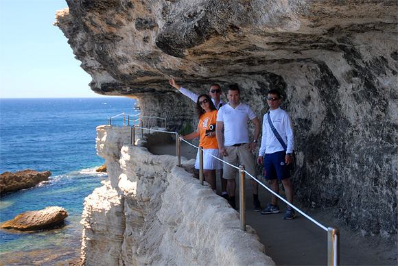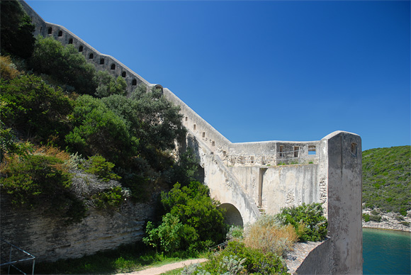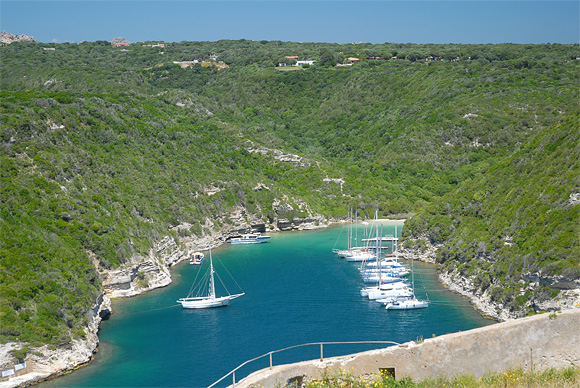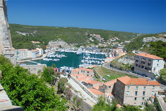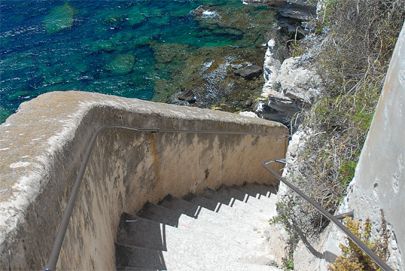 Bonifacio-ba tartottunk. A sziget legdélebbi települését egyben a legszebbnek is tartják, és az eddig látottak alapján, úgy gondolom, mi is megszavazhatjuk neki ezt a címet. A középkori vár egy földnyúlványon magasodik. A közvetlenül a várkapu mellett kialakított parkolóból a várfal lépcsőjén lehet feljutni a felső várba. A déli oldalra mentünk, hiszen onnan nyílt rálátás a tengerre és Szardínia szigetére. Innen indul Aragónia királyának lépcsője, amely egy sziklában vájt hasadékban visz le majdnem a tengerszintig, majd vízszintesen halad tovább még egy-két száz métert. A végén egy további lépcsővel le lehet jutni egy barlangba, illetve a vízig. A 187 lépcsőfokon lefelé sem egyszerű haladni, felfelé pedig még inkább fárasztó, nagyon-nagyon meredek.