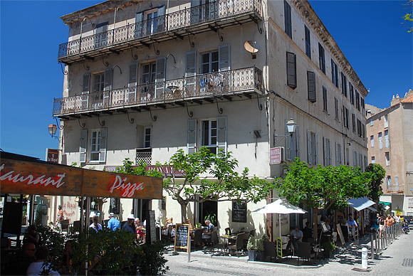Miután elhagytuk a kempinget visszamentünk Sartène-be egy kávéra, illetve körülnézni egy kicsit. A legkorzikaibb település főtere nem túl nagy, de nagyon hangulatos a teraszokkal, a pálmafákkal. A Hotel du Ville, azaz a városháza alatti kapun átmenve egy souvenir-es utcában találja magát az ember, ahol elköltheti az euróit. Amivel itt találkoztam először, és nagyon tetszett, hogy lehetett parafa képeslapokat kapni: vékony parafa lemezre barnával szitázták egyik oldalra valamely helyi látványosságot, a másikra pedig a megszokott képeslap grafikát.