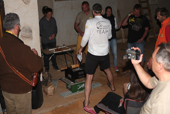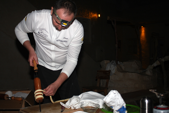 Gyula végül úgy döntött, hogy a szálloda szélvédett udvarán dagasztja meg a tésztát, de a sütésre kívül, a szálloda előtt kerül sor. A kürtőskalács itthoni alapanyagokból készült, a Bake'n'Roll-ba pedig hargitai bükkfaszén került. A Saharun résztvevők mellett természetesen a helyiek is megkóstolhatták az erdélyi finomságot. Két pincér az udvar sarkából követte figyelemmel, hogyan kerül fel a tészta a sütőfára, miközben halkan megbeszélték a látottakat.