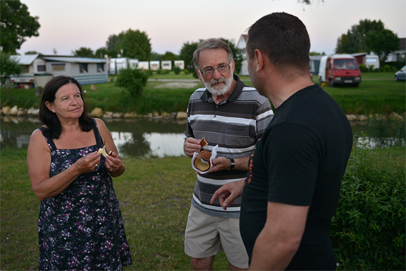 Egy patak mellett kaptunk parcellát az egyébként majdnem teltházas szálláshelyen. Ezt látva a kürtőskalács-sütés nem maradhatott el. Sajnos szenünk is elég kevés volt, Gáspár kért a szomszédoktól azzal, hogy megháláljuk egy kis kaláccsal. Így is lett, de nem csak ök kaptak, hanem a közelünkben lévő többi kempingező is.