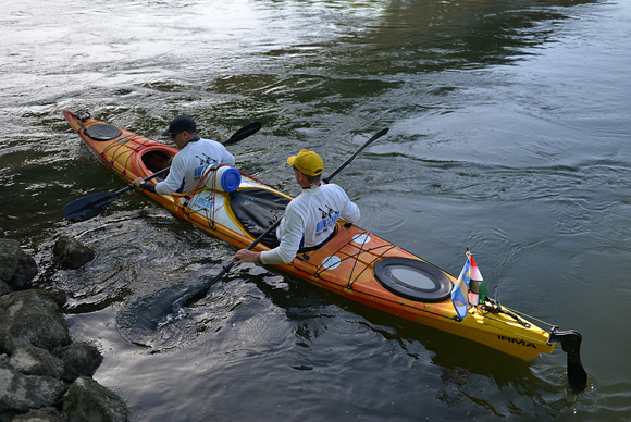 Az éjjel majdnem elvesztettük a kajakunkat. Történt ugyanis, hogy a már említett öbölben partra húztuk. Felmerült, hogy ki kellene kötni, de az ár-apály jelenséget kizártuk, nagy esőzésről meg nem tudtunk. Később a hajó orráról leoldoztuk a kötelet, mert ruhaszárítónak kellett. Reggel, amikor felkeltem, meglepve láttam, hogy eltűnt a part. A lépcsőn még lejutottam, kajakhoz viszont már csak a nádasban lépegetve tudtam odamenni. A víz már verdeste az oldalát. Messze persze nem jutott volna, hiszen legtávolabb, a kb kilenc kilométerre lévő Bertoldsheim-i erőműnél fennakadt volna, de mégiscsak kellemetlen lett volna azzal indítani a napot, hogy megkeressük a hajót.