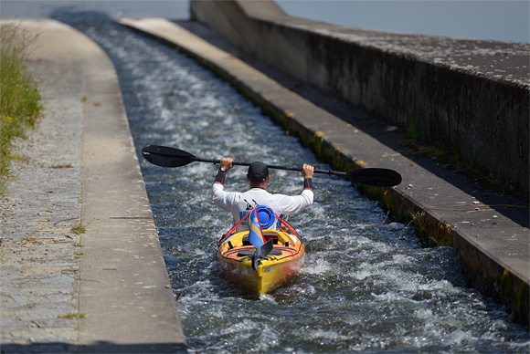Ma egy nagyobb városon, Straubingen vitt át a Duna. Itt volt az erőmű, és volt csúszda is, de nem volt százszázalékos. A kapuja nem működött, így a vízszint alacsony volt, de azért használhatóbb volt, mint tegnap Poikamnál. És piros lámpa sem volt. Ennek ellenére úgy döntöttünk, hogy egy emberes lecsúszást csinálunk, úgy hogy én kiszálltam és Gáspár kormányozta be a kajakot a csúszdába.