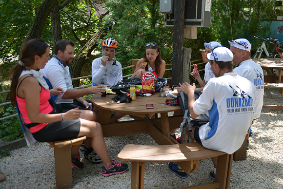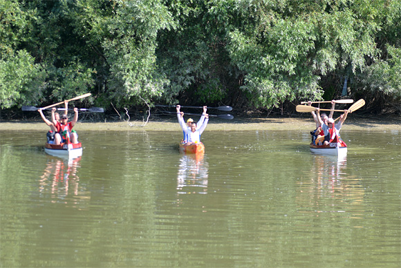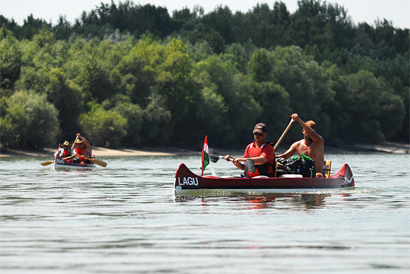 Esztergom előtt pillantottuk meg őket, amikor épp egy pihenő után visszaszálltak a hajóikba. Pár kilométerrel lejjebb értük utol őket, egy ideig együtt eveztünk, majd előre mentünk fotózni. Ezt követően mi kötöttünk ki pihenni, legközelebb és utoljára pedig az esztergomi hajóállomás melletti fövenyen találkoztunk. Ők élelmet vásárolni álltak meg, mi pedig itt találkoztunk a bringás csapattal.