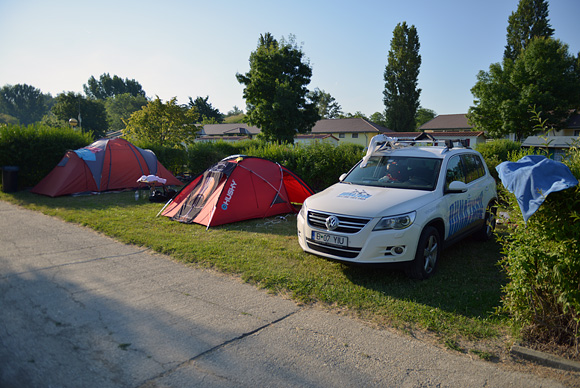 A neszmélyi kemping kellemes meglepetés volt. Egy igazán minőségi szálláshely, a Duna partján, amely úgy tűnik, elsősorban a külföldieket várja. Erre utalt számomra például az, hogy a feliratok, programajánlatok holland, német és angol nyelven voltak olvashatók, magyarul nem. A tágas, sövénnyel elválasztott parcellák egy részén holland mobilházakat helyeztek el, de a sátraknak is bőven volt hely. Egy negatívumot tudnék megemlíteni, a vízparti kempinget elözönlötték a szúnyogok, riasztó spray nélkül az ember jobb, ha ki sem jön a sátorból. Ami a kemping kihasználtságát illeti, óriási a kontraszt az osztrák és német kempingekhez képest, amelyek ebben az időszakban majdnem telt házzal üzemelnek.