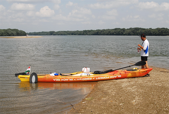 Reggel fél hétkor keltünk, én befejeztem a tegnapi beszámolót, Gáspár elment reggelit vásárolni, Attila pedig pakolt. Az eget felhők borították, de nem úgy nézett ki, mintha esni akarna, sőt, mire a vízre tettük a kajakot már a nap is kisütött. Ahogyan tegnap befelé jövet, egyedül eveztem ki a strandtól a zsilipig, ahol át kellett emelni a kajakot a kis csatornába. Így gyorsabb volt, mint a kétszáz méteren mindketten ki- és beszálljunk, ráadásul gyalog a táv is rövidebb volt. A csatorna előtti sziget felett eveztünk be a Dunába, és folytattuk utunkat dél felé.