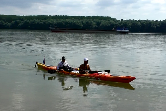 Dunacsébnél találkoztunk legközelebb. Nekem vissza kellett mennem Szerbiába, ezt a Palánkai hídon tettem meg. A kilépés Horvátországból gyorsan lezajlott, ám a szerb oldalon valamiért nagy sor alakult ki, így csak háromnegyed óra alatt jutottam be az országba. A már említett Dunacsébnél találtam egy lejárót a Dunához, egy csárda is volt ott, illetve egy sóderes part ahol páran napoztak, fürödtek. A rádiónk megint megtelt vízzel (az IP8-as védelemmel valami gond lehet), így Gáspárék kicst későn vették észre a parton álló autót. A túlpart közelében eveztek, felém fordították a kajak orrát és athúztak egy közelgő uszály előtt. A végén már megint az árral szembe kellett evezzenek, hogy a kamera előtt kössenek ki.
